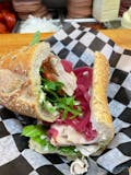 Chicken cutlet, provolone, gabagool, lettuce, tomatoes, sweet mustard & hot pepper relish.